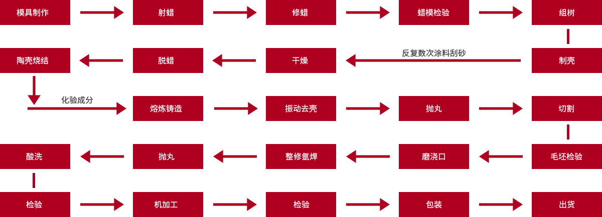 采用的硅溶膠熔模精密鑄造工藝,是一種少切削或無切削的鑄造工藝,是鑄造行業中的一項優異的工藝技術,它比國內大多數廠家采用的水玻璃工藝、復合工藝更先進,所鑄造的鑄件表面更加光滑平整,其應用非常廣泛。